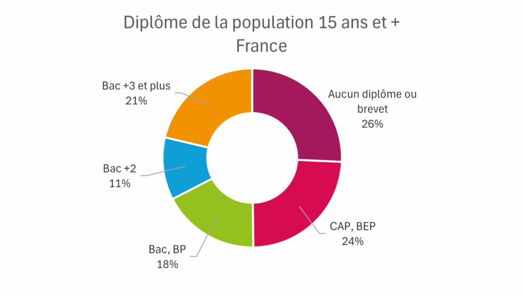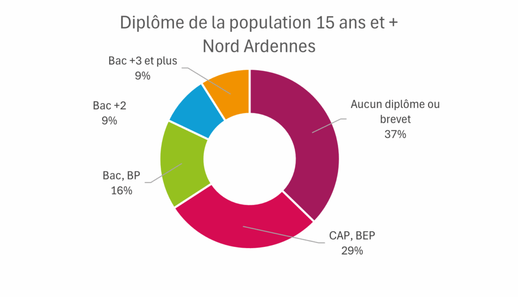 La population nord ardennaise est globalement moins diplômée. Si la part de lauréats de CAP à Bac +2 est similaire , 54%, les infra 3 (pas de diplôme ou brevet) représentent en France 1 quart de la population mais 37% en Nord Ardennes, les niveaux 6 et + (supérieur à bac + 2) 21% contre 9%.