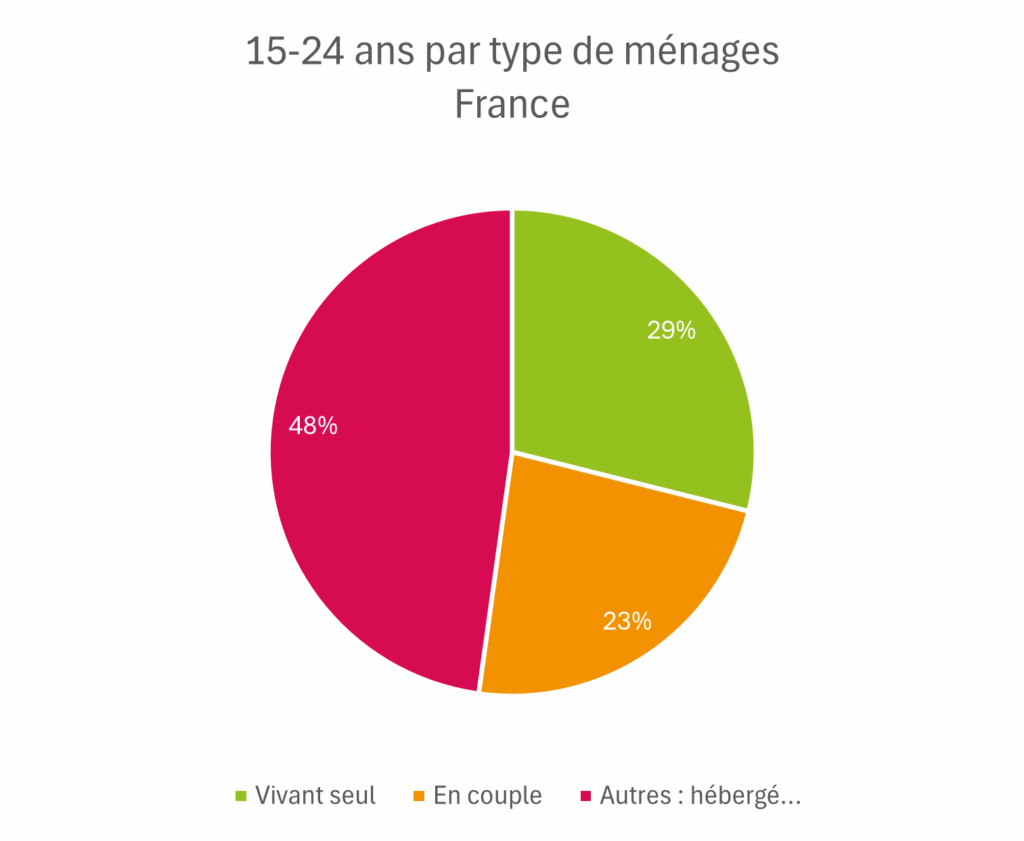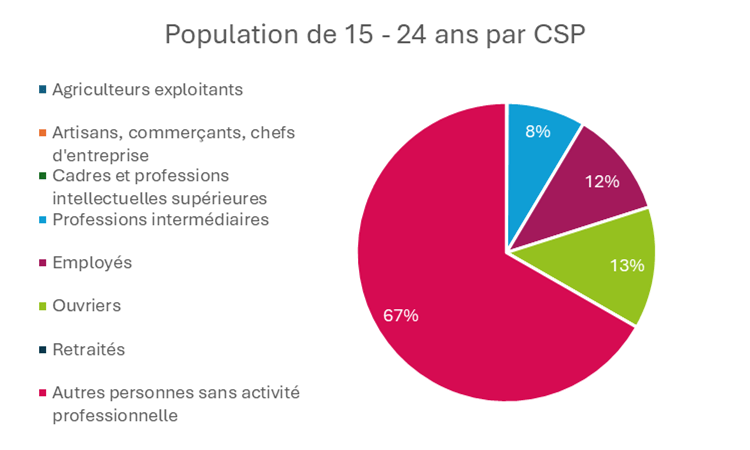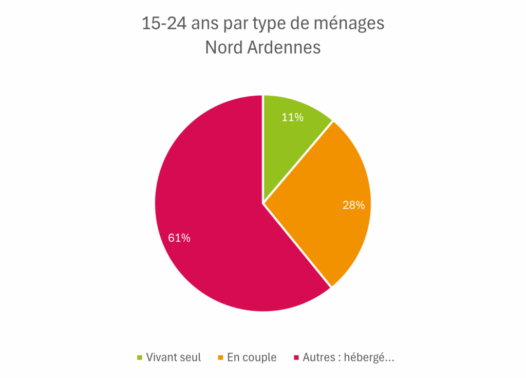 La part de jeunes vivant seul est nettement supérieure au national : 29%, quant à la part des jeunes hébergés par la famille, elle est en France de 48%. Ces différences s’expliquent notamment par le fait que le bassin n’est pas un bassin étudiant : 29% des 18-24 ans en études contre 52% au national.