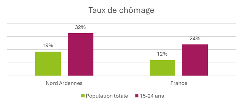 D’après cette définition le taux de chômage en France est de 7.5% contre 10.5% pour la zone d’emploi de Charleville Mezieres qui inclut le bassin Nord Ardennes. Cette mesure ne permet pas un zonage plus précis (d’ou l’utilisation de la 1ere définition). La encore, le taux de chômage des jeunes est nettement supérieur à celui du reste de la population. En 2024, au national, il atteint 18,8 % en moyenne sur l’année chez les 15-24 ans, contre 6,7 % chez les 25-49 ans et 4,9 % chez les 50 ans ou plus.